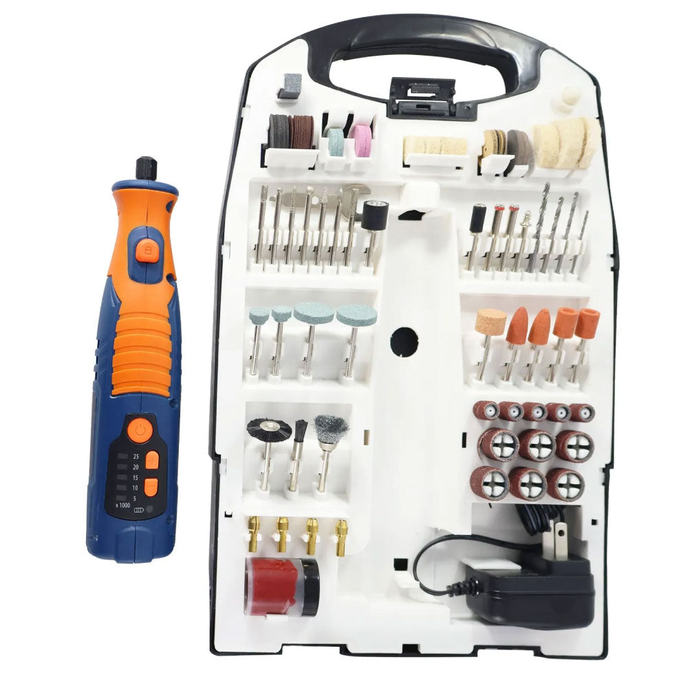 Con una velocidad variable de 5.000 a 25.000 RPM, permite adaptar su potencia al tipo de trabajo y material, ya sea para lijar, grabar, cortar, tallar, pulir o limpiar. Su mandril de 1/8" es compatible con una amplia gama de accesorios, y su funcionamiento inalámbrico garantiza total libertad de movimiento.